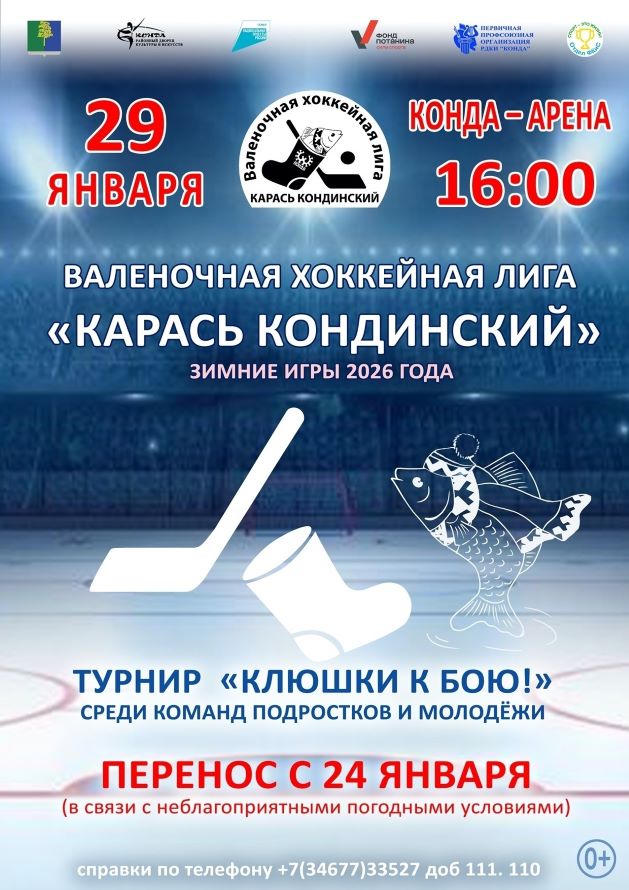 ВАЛЕНОЧНЫЙ хоккейный ТУРНИР «КЛЮШКИ К БОЮ» состоится среди команд подростков и молодежи (возрастная категория от 13 до 18 лет) в рамках реализации Творческого проекта «ВАЛЕНОЧНАЯ ХОККЕЙНАЯ ЛИГА «КАРАСЬ КОНДИНСКИЙ»