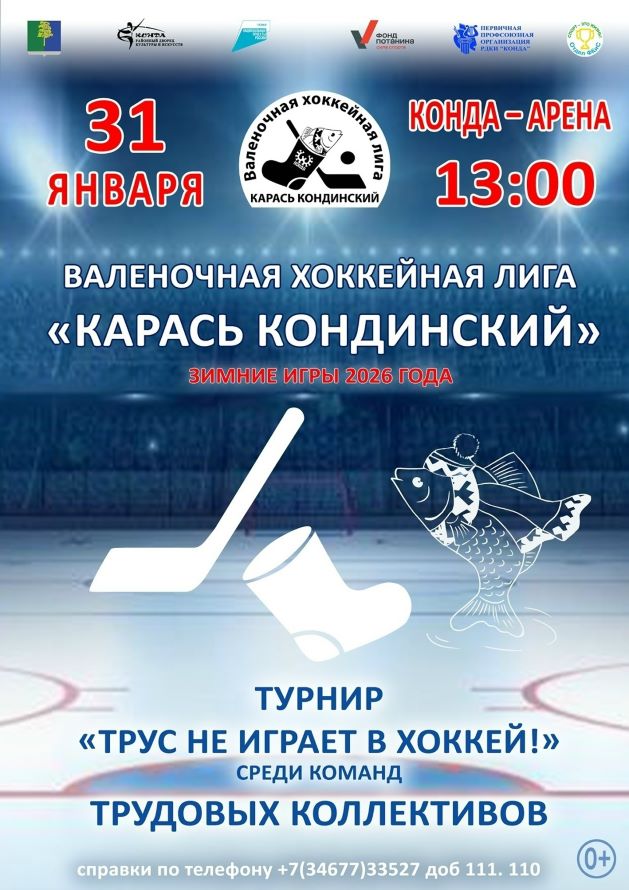 СОСТОИТСЯ валеночный хоккейный ТУРНИР «ТРУС НЕ ИГРАЕТ В ХОККЕЙ!» среди команд ТРУДОВЫХ КОЛЛЕКТИВОВ в рамках реализации Творческого проекта «ВАЛЕНОЧНАЯ ХОККЕЙНАЯ ЛИГА «КАРАСЬ КОНДИНСКИЙ»