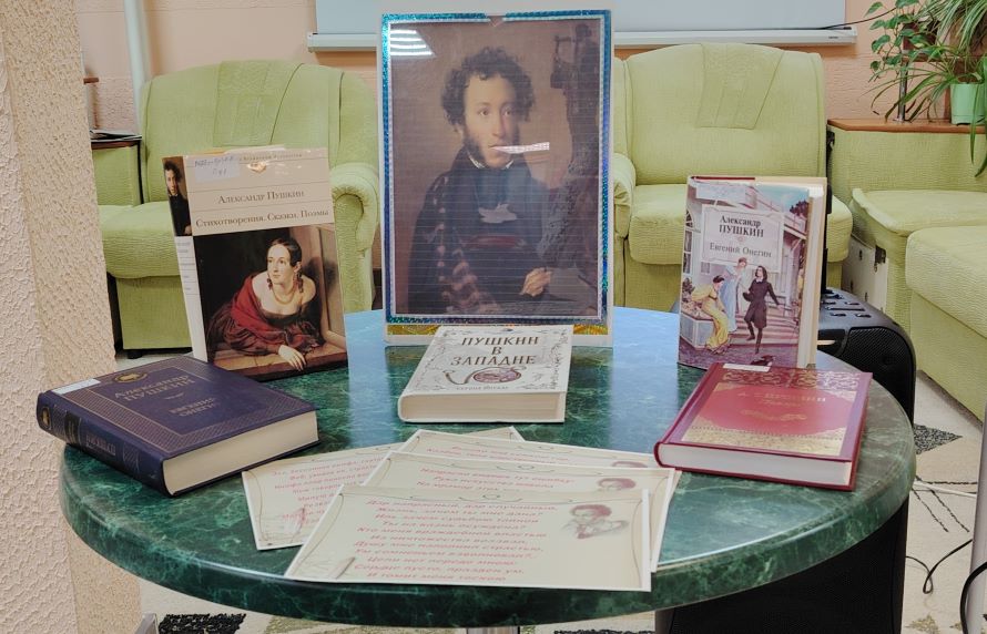 Рассказ плавно перетёк к книжной выставке, где в красивых изданиях были представлены знаковые произведения автора. Портрет Пушкина, размещённый в центре, стал символическим фокусом, притягивающим взгляды гостей, которые с интересом листали страницы, вспоминая любимые строки.