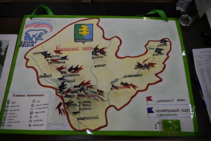 Используя условные обозначения в виде флажков различного цвета, автор выделил объекты завершенные и планируемые. Получился своеобразный путеводитель по исполнению народной программы – Карты развития Югры в муниципалитете.