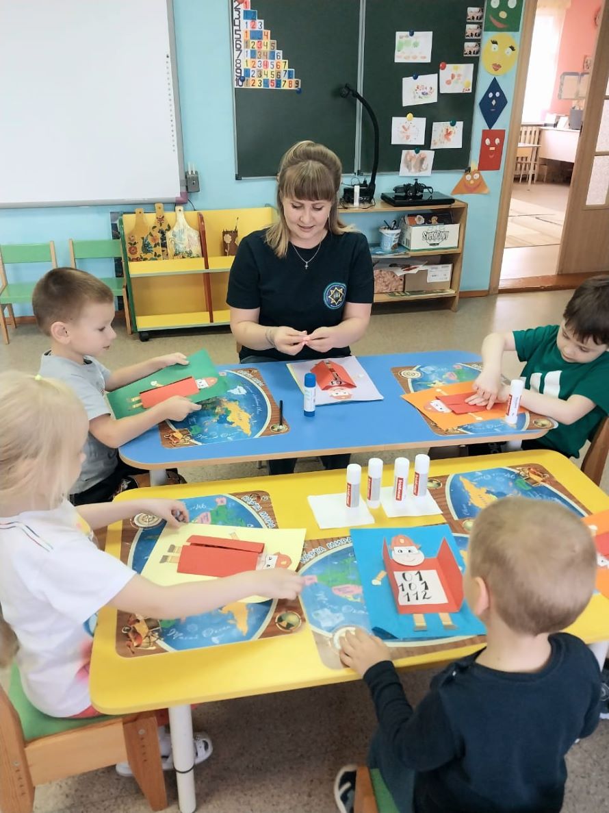 После беседы, перешли к творческому заданию, а именно смастерить бравого огнеборца. С большим старанием дети делали аппликацию. Работы получились разные, но все они аккуратные и красочные.