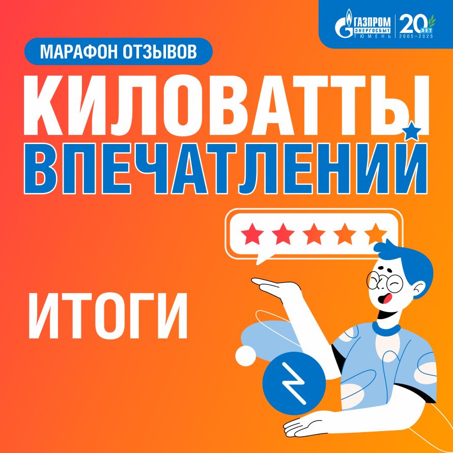 Марафон «Киловатты впечатлений», приуроченный к 20-летию энергосбытовой компании, проходил с 10 июля по 10 октября. Потребителям предложили оценить качество взаимодействия с компанией, поделиться мнением о работе контактного центра и центров обслуживания клиентов в населенных пунктах ХМАО-Югры, ЯНАО и Тюменской области, оставив отзыв в популярных электронных справочниках.