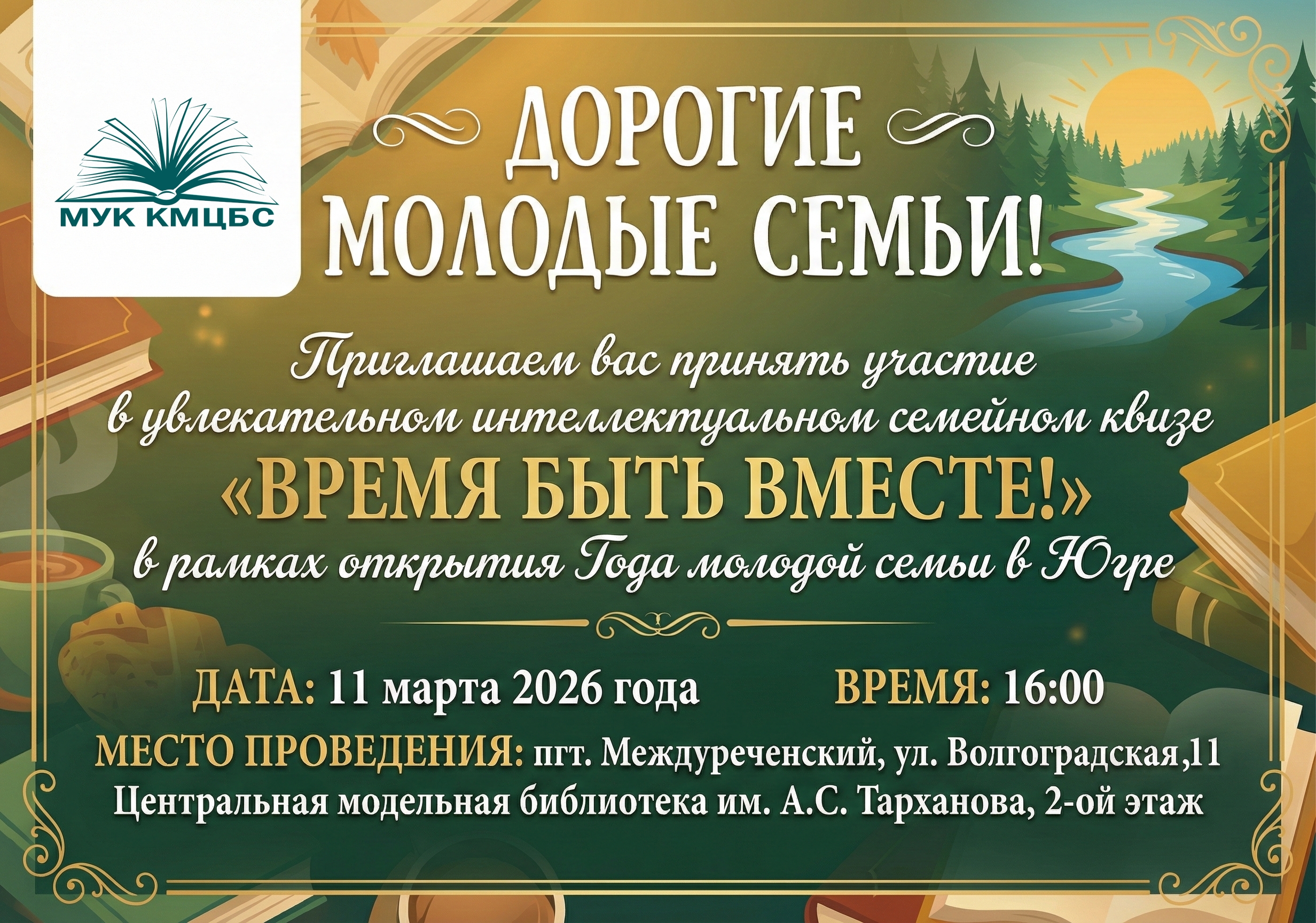 В рамках торжественного открытия Года молодой семьи в Югре Центральная модельная библиотека им. А.С. Тарханова с радостью приглашает вас принять участие в увлекательном интеллектуальном семейном квизе "ВРЕМЯ БЫТЬ ВМЕСТЕ", специально разработанном для вас!